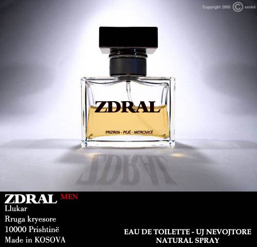 Parfumi parė vendor "ZDRAL". Moti ėshtė nė pėrdorim, por pėr here tė parė po paketohet. Pėrbėrja(ingredients): dizell, ujė shishe, octyl methoxycinnamate, extrakt i djersės natyrale, pollikollor, zdral i kultivuar, thonjtė e bluar dhe plot sene tjera. 100% i KOSOVĖS. |